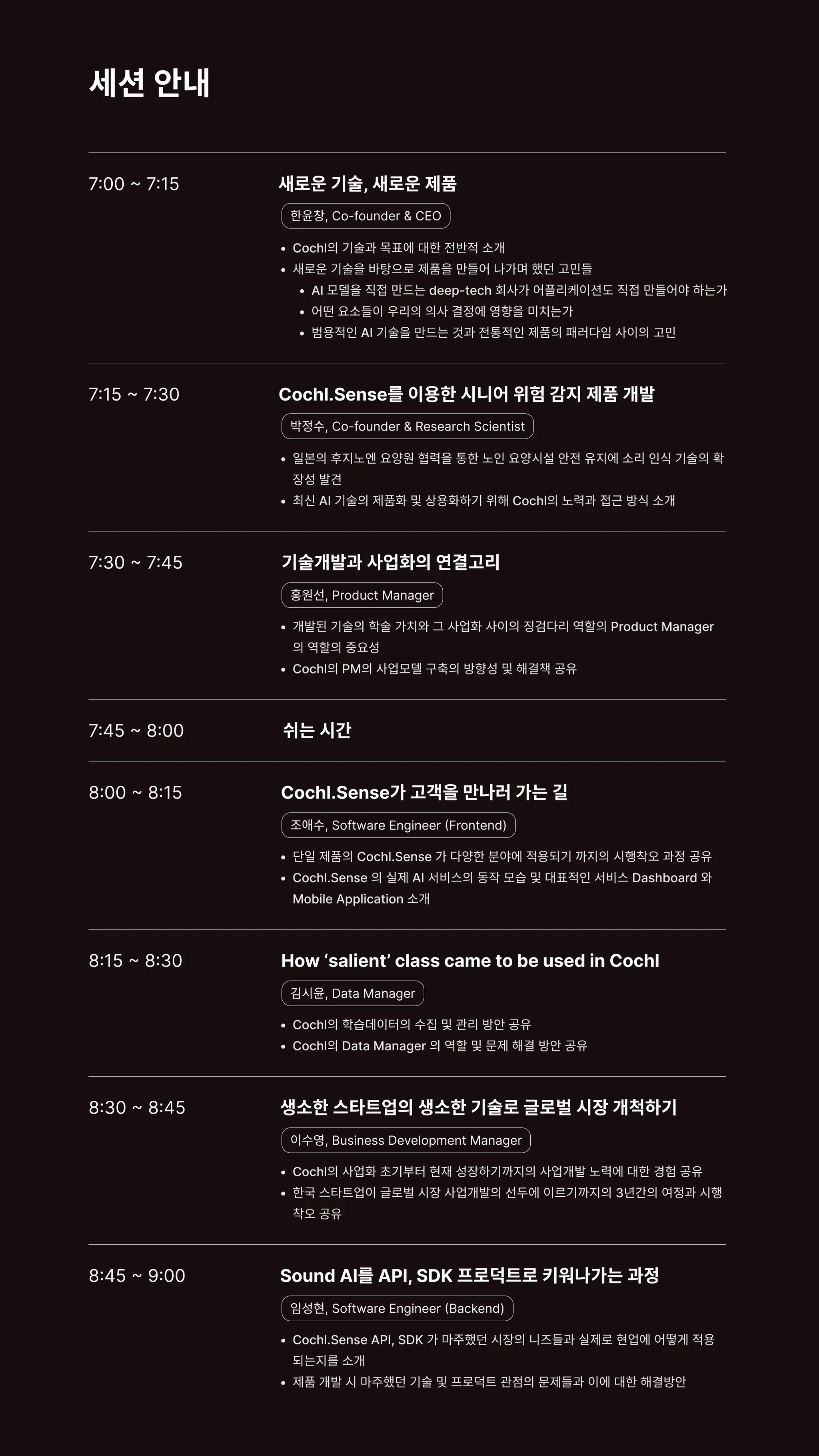 하지만 대부분 Sound AI와 Cochl을 알리기에는 단편적인 내용만 공유할 수 있었기에 더 깊은 이야기를 나누고 싶다는 생각이 들었습니다. 특히나 이번 2023년의 경우, Cochl 내의 기술 측면에서의 발전과 사업 측면에서의 발전이 동시에 만족스러운 성과를 낸 지점입니다. ‘만약 우리가 어떻게 이런 성과를 만들어 낼 수 있었는지를 사람들과 공유할 수 있다면, 더욱 풍요로운 AI 생태계를 만들 수 있지 않을까?’ 라는 목표를 가지고 Cochl의 오프라인 이벤트 준비의 막이 올랐습니다.