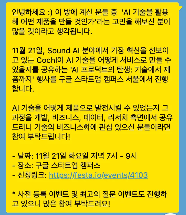 이번 이벤트의 경우 대상은 명확하게 ‘AI 프로덕트를 만들어 나가는 사람들’이라고 넓게 잡았고, 사람들이 참여하기 쉽게 저녁 7시, 삼성역에 있는 구글 스타트업 캠퍼스에서 진행하게 되었습니다. 홍보 플랫폼은 festa라는 이벤트 플랫폼을 사용했고, 추가로 이벤터스에도 동일하게 이벤트 홍보 내용을 올렸습니다. 만약 Cochl이 누구나 알고 있는 대기업이면 모객이 쉬웠겠지만, 아직은 많이 생소한 분야를 다루고 있어 모객을 위해서는 더 깊은 터치가 필요했습니다.