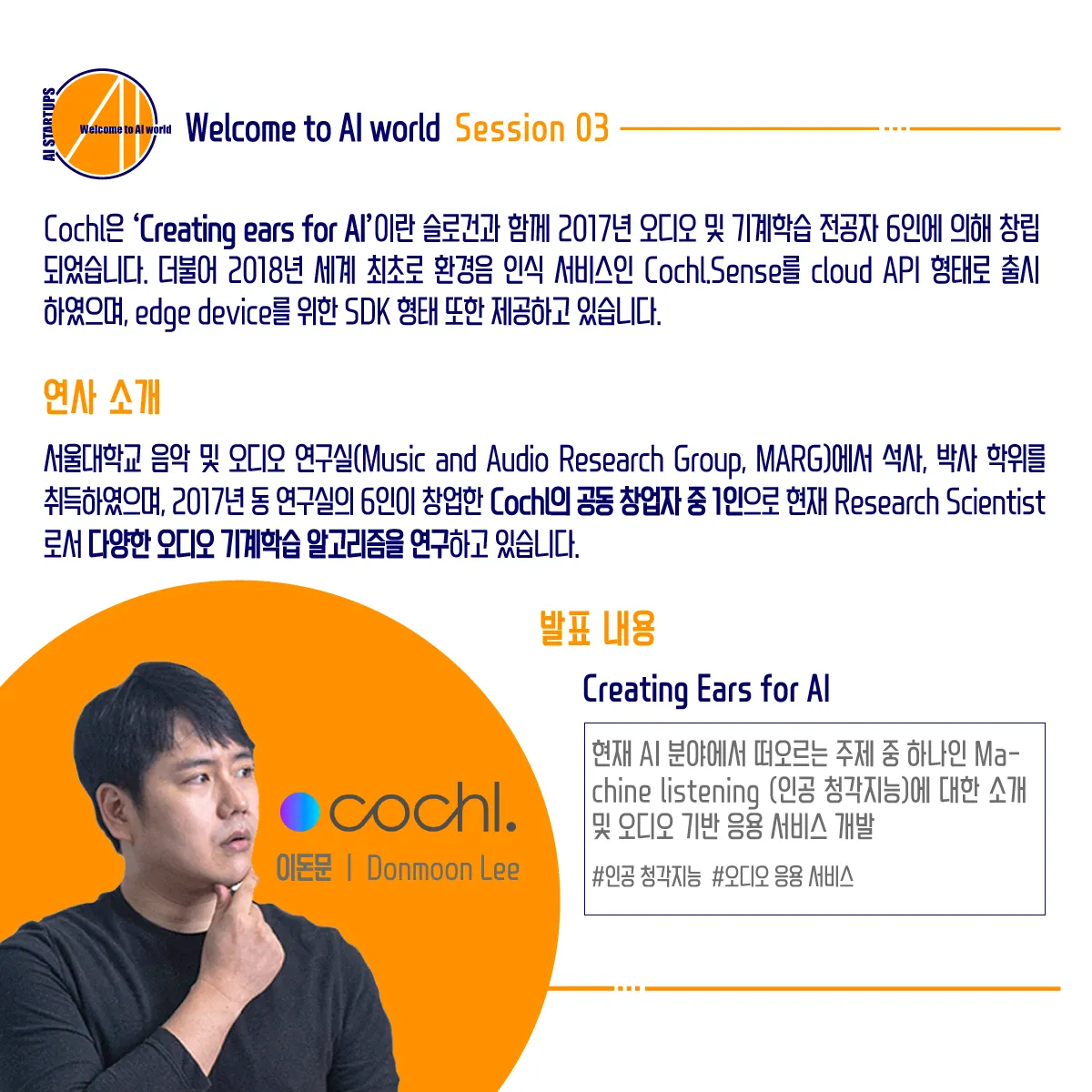 Cochl은 Sound AI 기술을 개발하는 딥테크 스타트업입니다. 최근 AI에 관한 관심이 점점 더 높아지고 있지만, AI 분야 내에서 Sound와 관련된 파트는 상대적으로 생소한 편입니다. 특히나 음성 인식을 통해 AI 스피커를 활용하거나, 음성을 텍스트로 바꾸는 (Speech-to-text) 경험은 일상생활에서 접해본 적이 있더라도, 그 외의 Sound AI 기술을 일상에서 만나기는 쉽지 않습니다. 그래서 Cochl은 지속해서 Sound AI를 널리 알리기 위해 창립 이후로 여러 채널을 통해 사람들에게 기술을 공유하고, 흥미를 느낄 다양한 활동들을 해왔습니다.