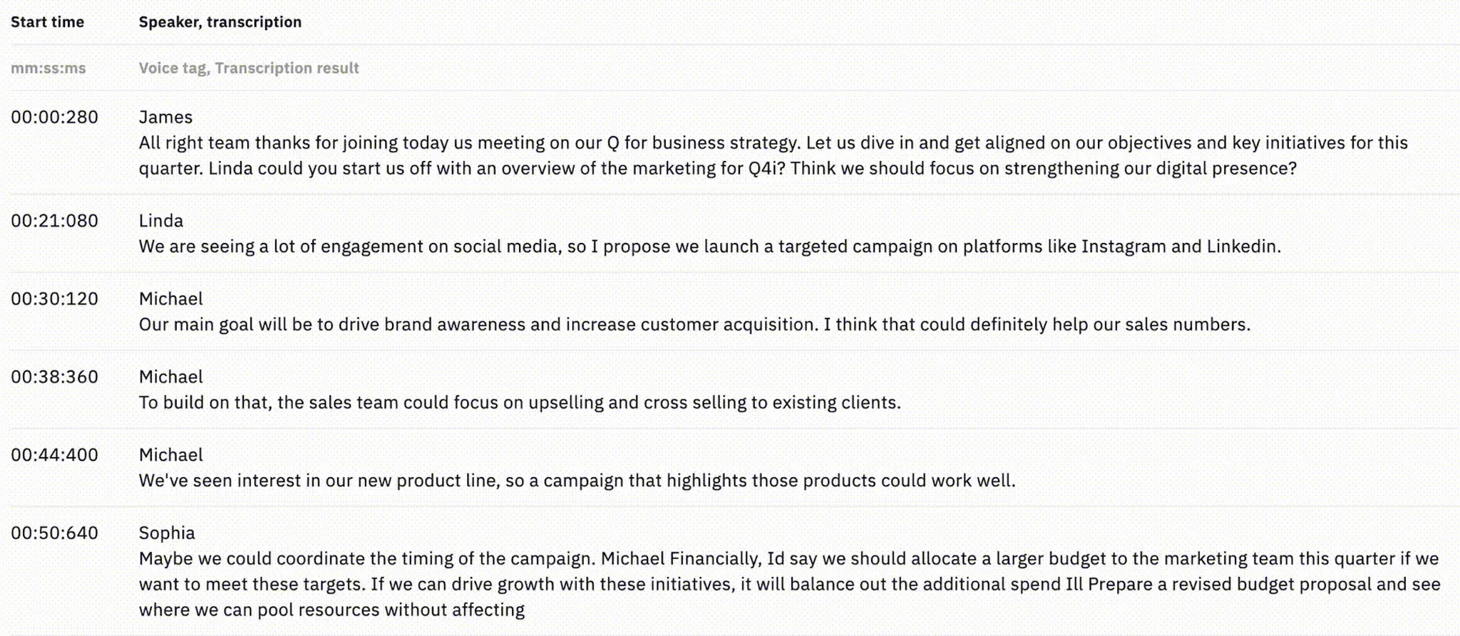 모두가 잘 알고 있겠지만, 팀 미팅에서 참석자들이 어떤 내용을 말했는지를 정리해서 앞으로 어떤 일들을 해야할지 액션 아이템을 정하고, 타임라인을 설정하는 것은 중요합니다. 하지만 이는 한 사람이 모두 맡아서 기록하기에는 방대한 양일 수도 있고, 혹은 잘못 작성된 부분이 있을 수도 있습니다. 이 때 화자 인식 기술을 활용한다면 미팅 참석자별 발언을 정확히 정리해 필요한 정보를 쉽게 확인할 수 있습니다.
