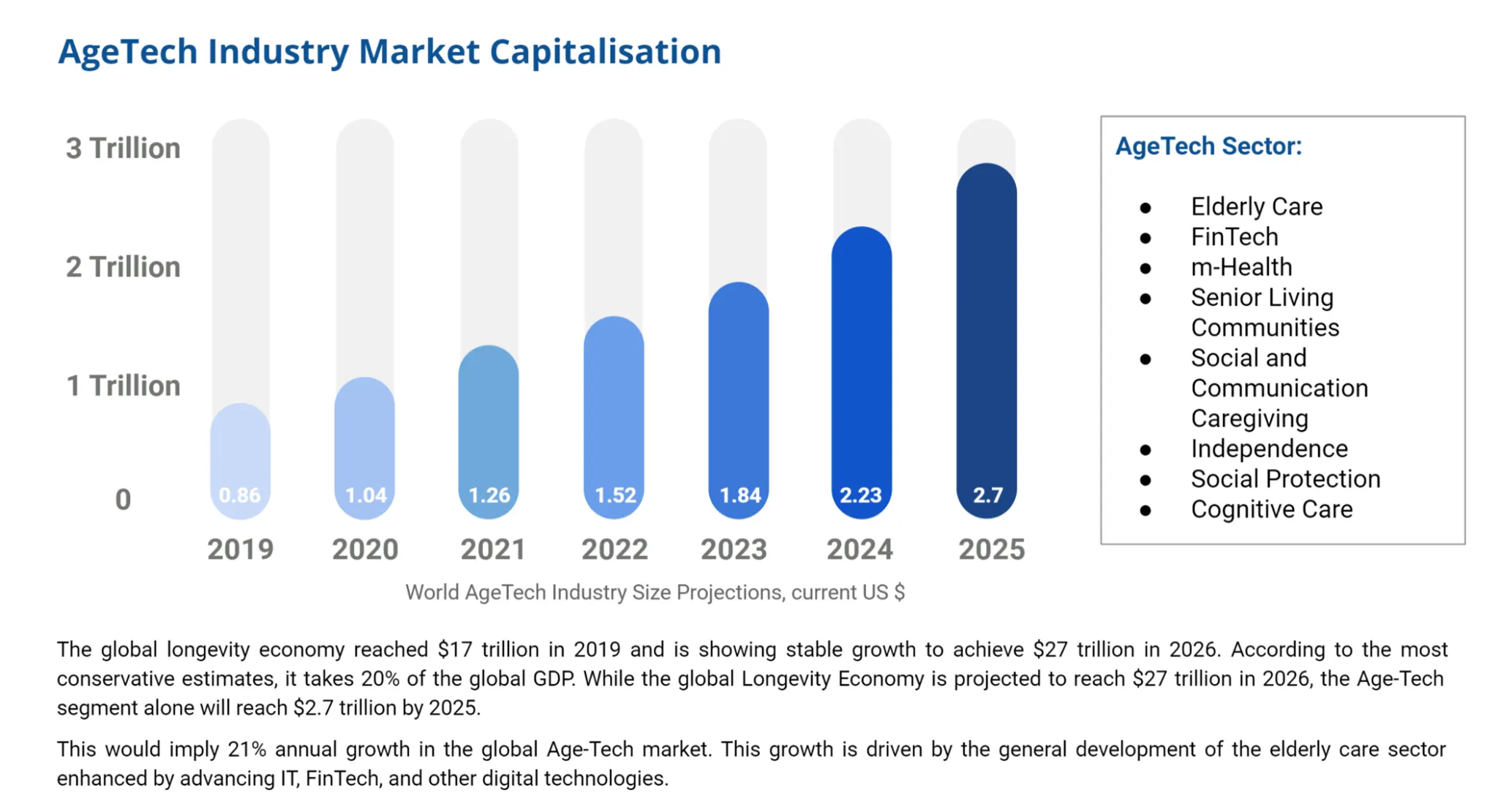 올해 열린 CES 2025에서는 고령화 사회를 위한 기술, Age Tech가 큰 주목을 받았습니다. 우선 Age Tech란 고령 친화 기술로 인공지능, 사물 인터넷, 웨어러블 디바이스 등과 같은 기술을 활용해 고령자의 일상생활을 지원하고 건강 관리를 돕습니다. Aging Analytics Agency에 따르면 2025년 Global Age Tech 시장 규모는 2.7조 달러에 이를 것으로 예상됩니다.