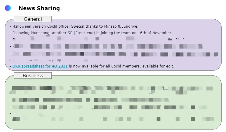 이전의 경우 간단하게 진행했지만, 타운홀 후 진행되는 피드백 서베이에서 보다 자세한 내용을 공유받기를 원해 팀별로 최대한 공유할 수 있는 범위 내에서 많은 것들을 공유하려고 합니다. 일회성으로 공유가 휘발되는 것을 방지하고자, 타운홀이 끝난 후에는 피드백 서베이에 공유 링크를 함께 첨부해 다시 한번 찬찬히 훑어볼 수 있도록 안내해 드리고 있습니다. 캡처에는 나와있지 않지만, 신규 입사자 소개, 생일자 축하 등 좋은 소식을 팀원들과 함께 나눴습니다