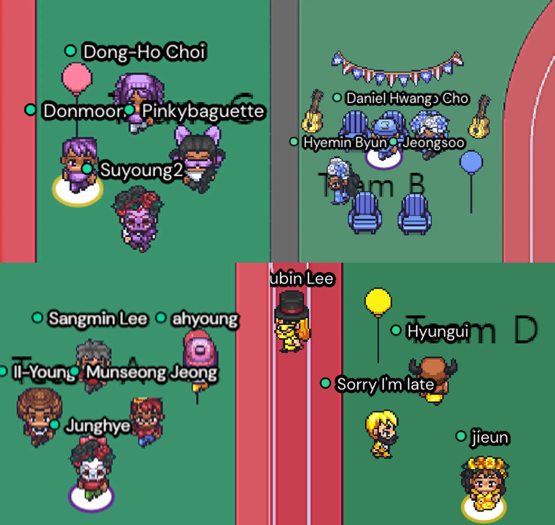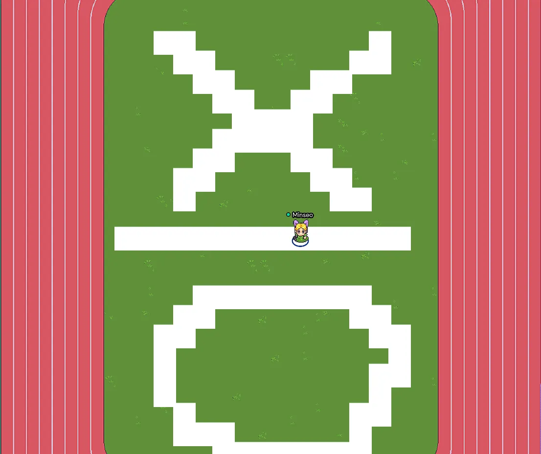처음 게더타운을 접해본 터라 이렇게 맵을 크게 만들 생각이 없었지만 나름 대대익선이라고 '오히려 좋아~'를 외쳐봤습니다. 팀원들이 한땀 한땀 제가 수놓은 줄 알았던 이 잔디밭과 트랙은 사실 소스를 다운받아서 만들어 봤고 중간에 O, X만 제가 열심히 그려봤네요 ^.~