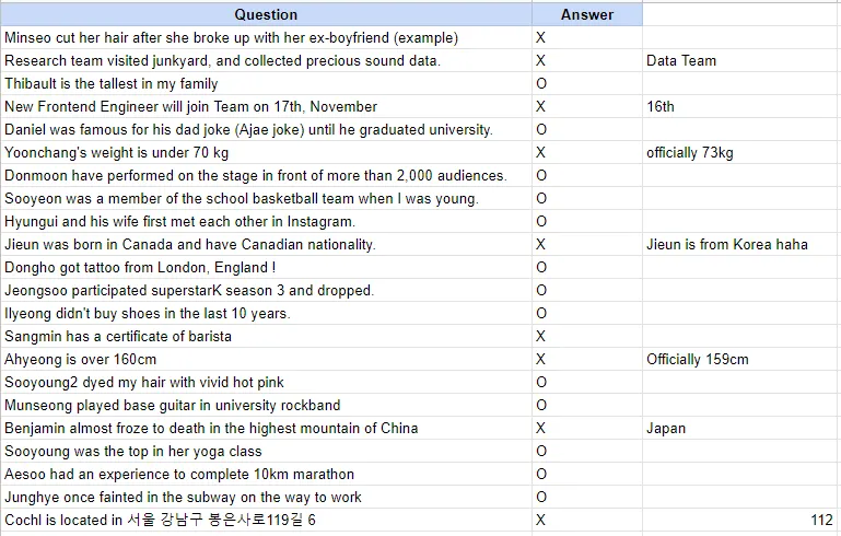 그러다 보니 액티비티를 기획할 때도 항상 1) 상호 간의 대화를 할 수 있는 2) 각 팀원에 대해서 잘 알 수 있는 활동을 하려고 고민하고 있어요. 그저 먹고 마시는 게 우리가 생각하는 타운홀의 목표는 아니잖아요 ;) 이번 타운홀은 OX Game으로 서로에 대해서 더 잘 알 수 있도록 각자가 가지고 있는 TMI에 대한 퀴즈와 Cochl에 대한 퀴즈를 내보았습니다. 개인전보다는 팀전으로 진행 해 보다 서로 많이 이야기하고, 답변을 공유하실 수 있도록 구성 해봤어요.