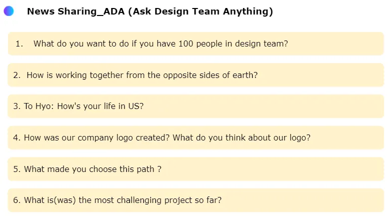 다른 팀은 어떤 사람들로 구성되어 있을까? 저 팀이 궁금해요!! 라는 팀원들의 피드백을 바탕으로 매달 진행되는 Ask OOO Anything입니다. 이번 타운홀에서는 Design 팀이 그 주인공이었습니다~ 한 분은 미국 다른 한 분은 한국에서, 지구 반대편에서 함께 일하는 Design 팀이라니! 많은 분이 협업에 있어서 어려운 점은 없는지를 많이 궁금해하셨는데 두 분은 이제 호흡이 척척! 영혼의 파트너가 되었다고 답변 주셨습니다