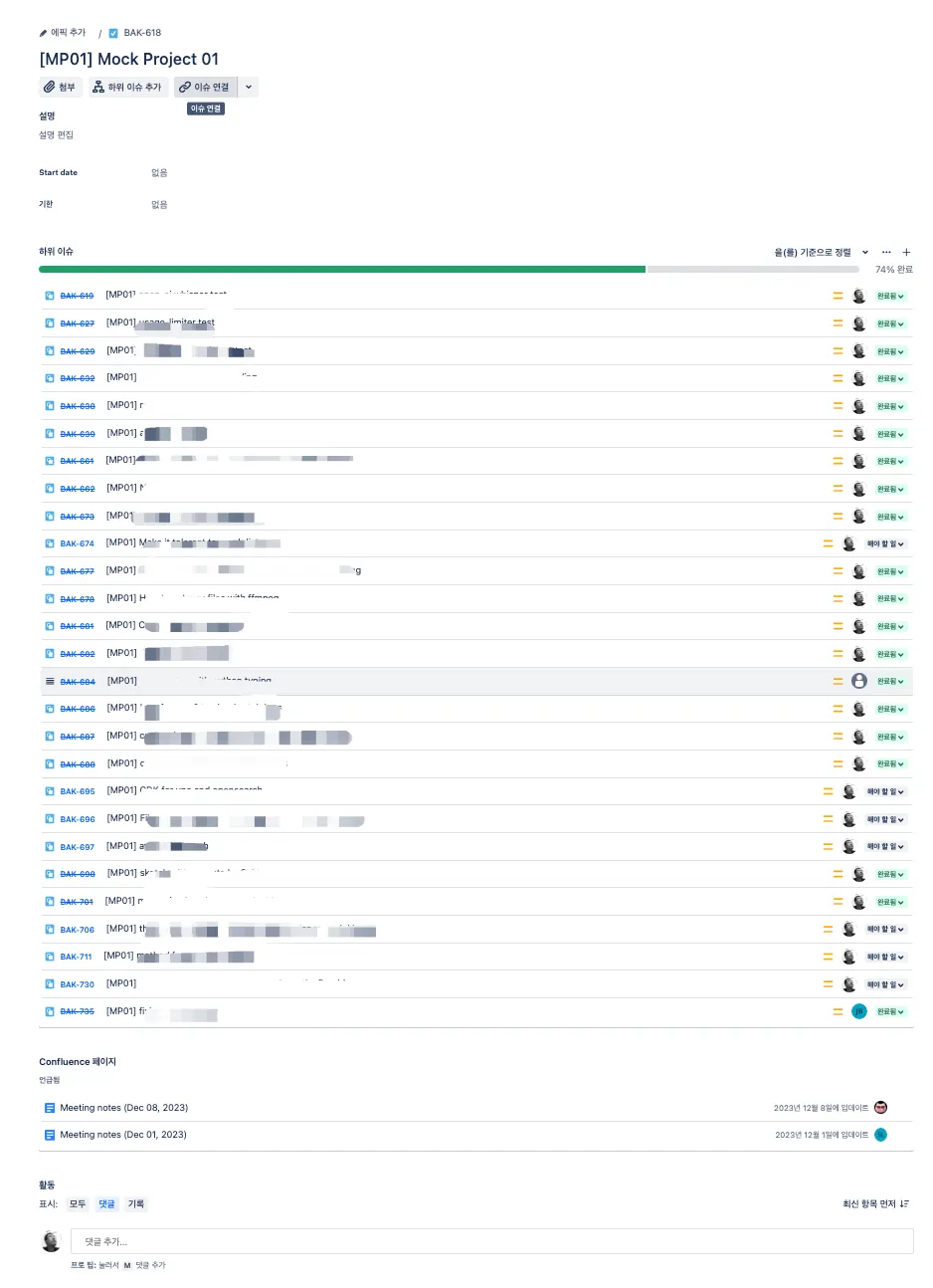 마지막으로 저는 Jira에 많이 남겨놓는 편이에요. 혼자 작성하는 투두리스트는 내가 자신에게 공유하는 것에 가깝기에, 타인에게 나의 업무나 상황을 공유하는 데는 제약이 뒤따를 수 있습니다. 그래서 타인과 공유하는 Jira task에 내가 하고 있는 업무나 집중하고 있는 일들을 작성해둬 저 또한 업무가 어느 정도의 과정에 와있는지를 확인하고, 타인에게 필요한 경우 공유하고 있습니다.