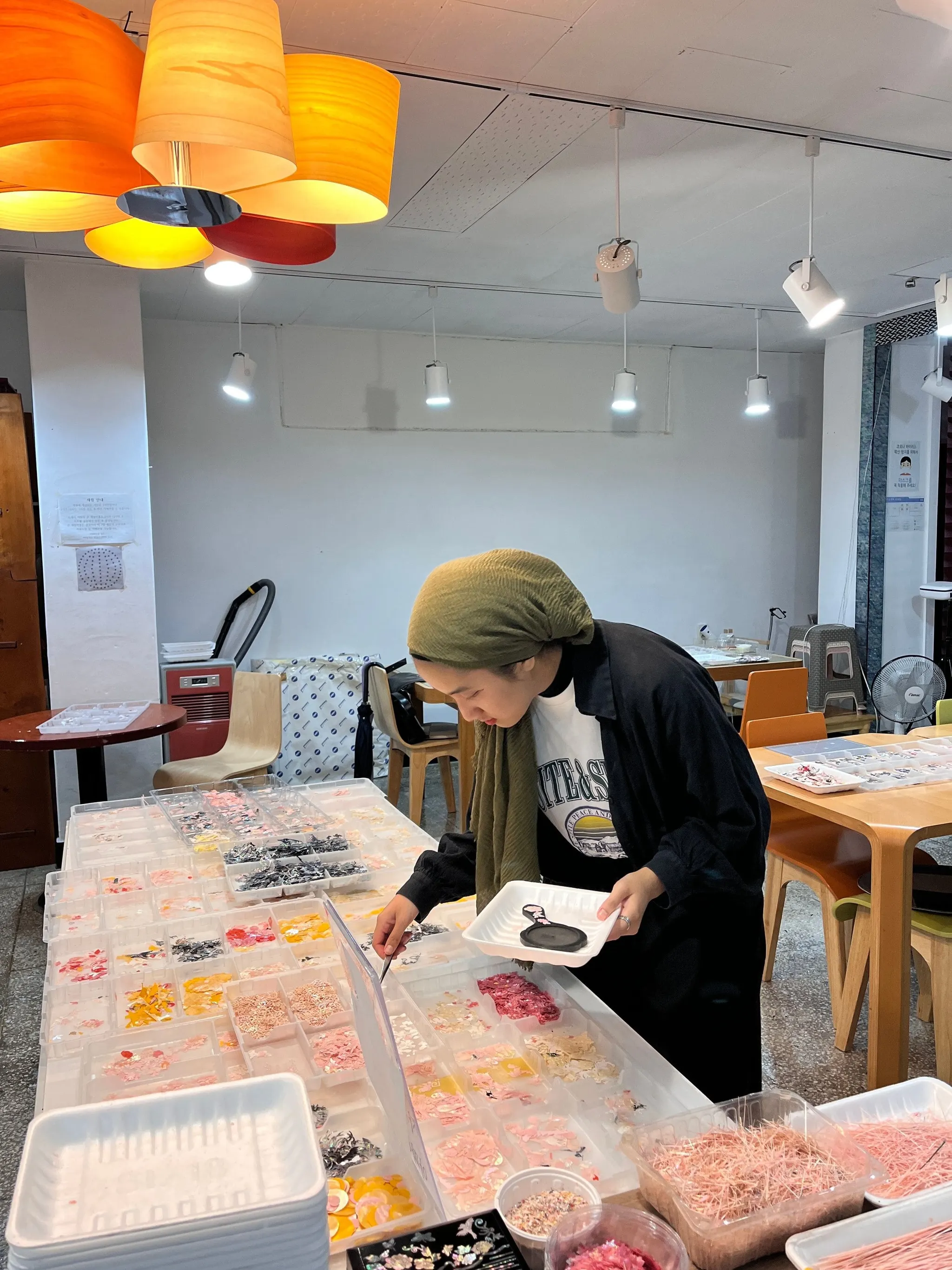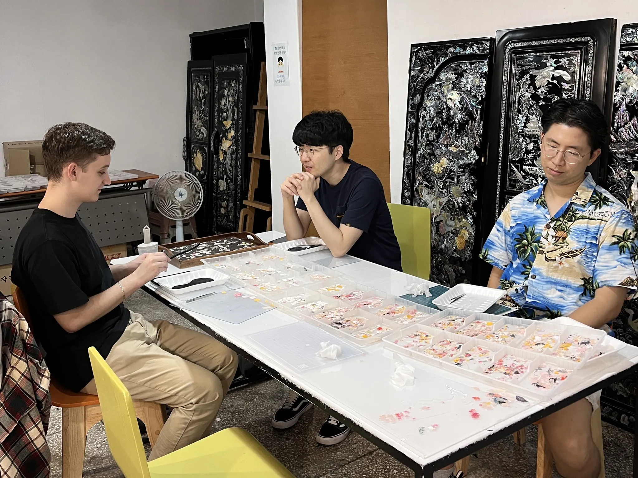 마지막 3조는 자개를 활용한 공예 작품을 만들러 떠났습니다. 다양한 자개 재료를 골라, 아름다운 작품을 만드는 경험! 더 이상 자개는 할머니 댁에 있던 가구가 아니라, 한국을 알리는 데 일조하는 전통이랍니다