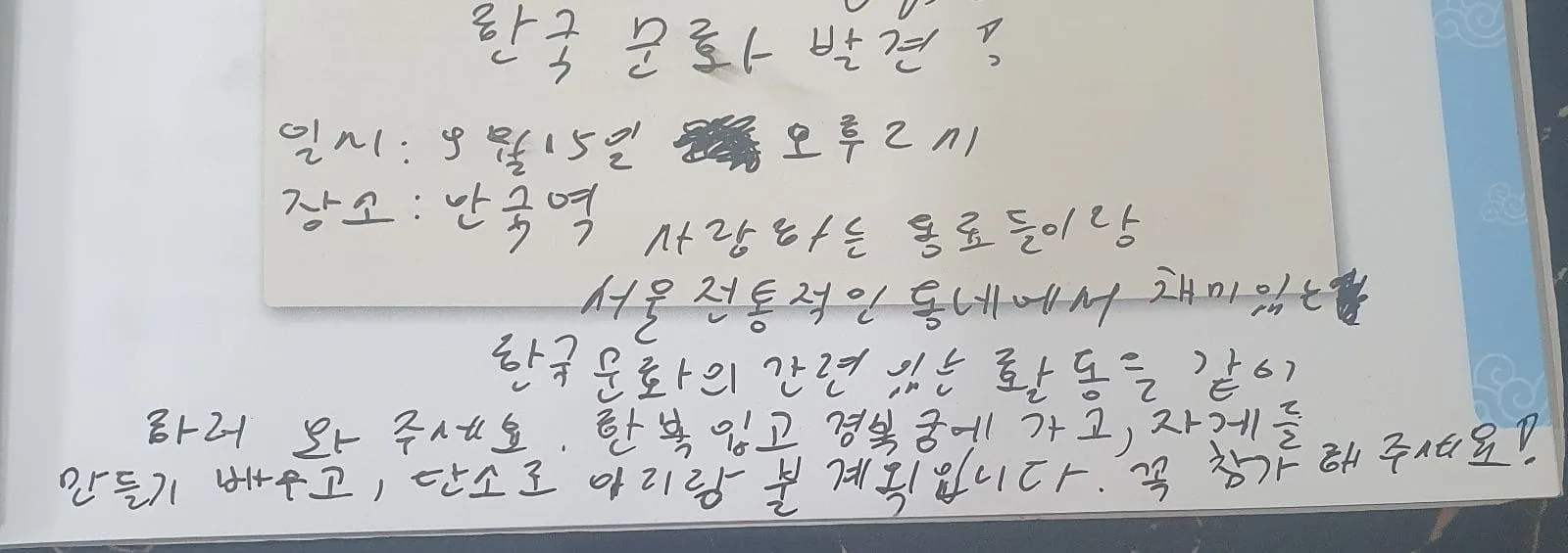 2주가량 모든 팀원을 혼란에 빠뜨린 야유회! 드디어 행사 2일 전 공지가 떴습니다. 바로 ‘어서 와 COCHL 추석은 처음이지’라는 제목의 행사로 한국 문화와 함께하는 야유회였습니다. Cochl의 노션을 주의깊게 보신 분들이라면 알 수 있겠지만, Cochl은 다국적 팀원으로 이루어져 있습니다. 한국을 제외한 프랑스, 스위스, 인도네시아, 미국 등 여러 나라에서 온 팀원들 또한 다가오는 명절, 우리의 정을 느낄 수 있도록 기획된 행사였죠.