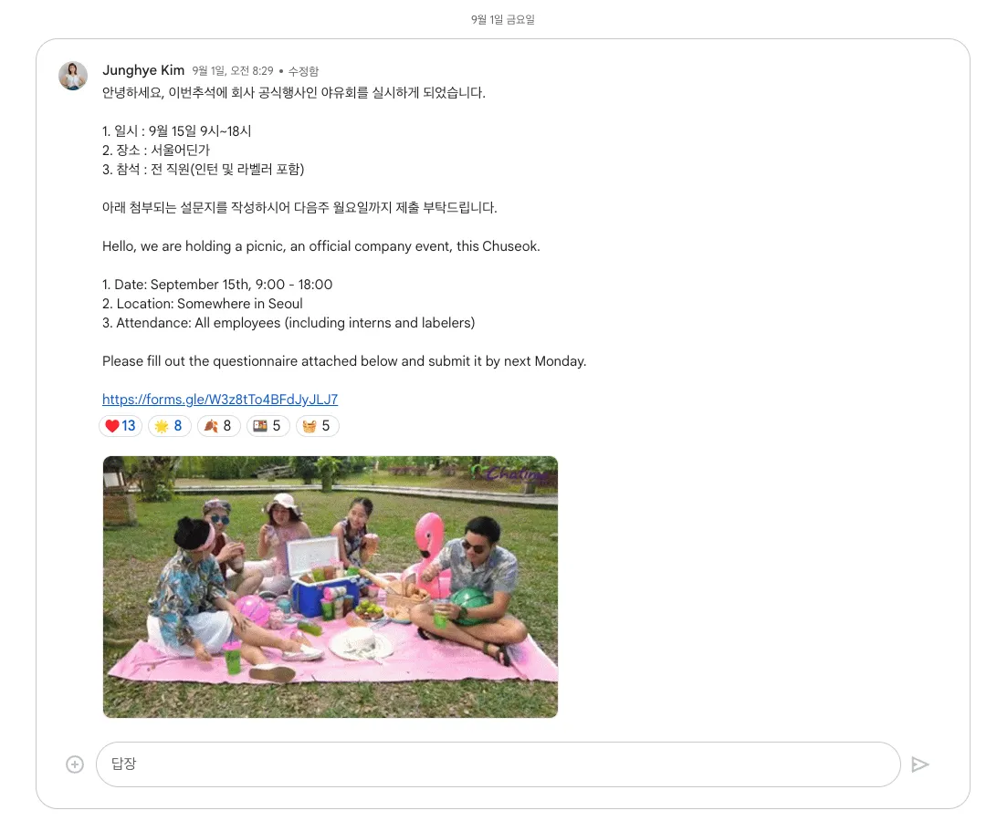 9월 1일, 아침 업무를 시작하려던 우리의 졸린 눈을 번쩍 띄워 줄 한 통의 메시지가 Notice 채널에 떴습니다!  바로 이번 추석, 공식 야유회가 진행된다는 공지였는데요, 모든 팀원이 공지를 읽자마자 어디로 가는 것이냐, 뭐하냐 등등 궁금증이 폭발했습니다.