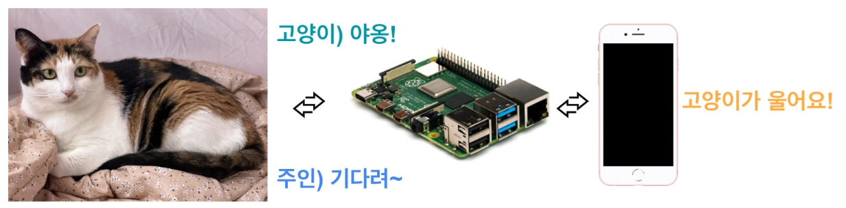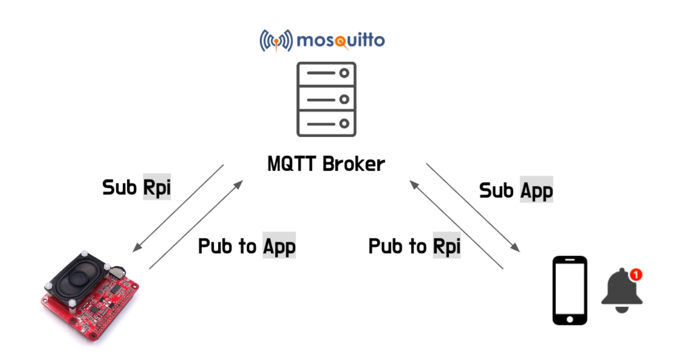 아까 말씀드렸듯이 토픽 기반으로 작동되기에 라즈베리파이라는 토픽을 구독하고 앱에서는 앱이라는 토픽을 구독합니다. 고양이 울음소리가 발생했을 때 앱 토픽으로 메시지를 발송하면 앱 토픽을 구독하고 있는 어플리케이션에서는 알림을 받을 수 있습니다. 어플리케이션에서 알림을 받고 버튼을 누르면 Rpi(라즈베리파이) 토픽으로 퍼블리시 메시지를 날리게 됩니다. 그러면 Rpi 토픽을 구독하고 있는 기기로 메시지가 날아가게 되고, 사용자가 이미 녹음한 음성을 재생하게 됩니다.