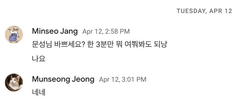 팀에서 고양이 4마리를 모시고 있는 개발자분을 호출! 아주 간단하게 짜인 제 아이디어를 설명해 드렸습니다. 그리고 독립적인 개체라고 알려진 고양이도 집에 혼자 있으면 분리불안을 느낄 수 있고, 그럴 때 강아지가 하울링 하듯 고양이도 소리를 낸다는 정보도 함께 입수했습니다. 흠, 그렇다면 고양이가 불안해할 때 주인이 없어도 주인의 목소리가 들린다면 고양이를 진정시킬 수 있지 않을까요?