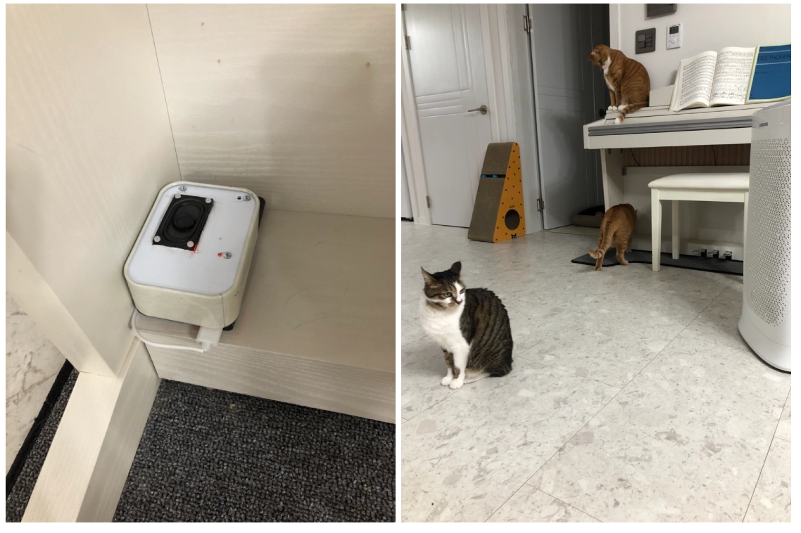 처음에는 고양이들이 제 목소리에 잘 반응 해줬습니다만 한 가지 간과한 부분이 있었습니다. 고양이가 울었을 때 들려주는 제 목소리를 딱 1개의 예제만 녹음해둔 나머지 나중에는 고양이들이 제 목소리에 익숙해져서 목소리가 들려도 울음을 멈추지 않았습니다. 이 부분은 여러 개의 예제 샘플을 만든다거나 실시간으로 들려주는 기능을 추가하는 등의 보완이 필요해 보였습니다. 아래 동영상에서 실제로 어떻게 작동하는지 보실 수 있습니다.