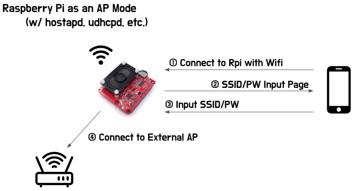 라즈베리파이를 AP모드로 작동시키면 라즈베리파이가 마치 공유기처럼 작동하여 사용자의 모바일 기기가 와이파이를 통해 라즈베리파이에 접속할 수 있습니다. 접속 시 주변 공유기의 아이디와 패스워드를 입력할 수 있는 창을 보여주고 모바일 기기에서 공유기의 아이디와 패스워드를 입력해주면 외부 공유기에 연결이 되게끔 하는 구조로 구현했습니다. 이 작업은 생각보다 쉽지는 않았습니다. 사용자들이 사용하기에도 원터치로 모든 것이 해결된다던가 간단하게 할 수 있는 방법은 아니었으나, 문제를 해결하기 위해서 저희가 할 수 있는 가장 나은 방법이라고 생각되었습니다.