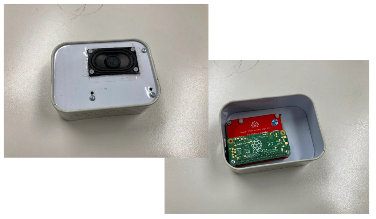 보시면 아시겠지만 이미 판매되고 있는 틴케이스를 구해 직접 잘라 나사못을 박고 라즈베리파이를 고양이의 공격으로부터 안전하게 지키기 위한 모든 준비를 끝냈습니다. 라즈베리파이와 스피커, 마이크 기능을 하는 모듈을 함께 붙여 제작했습니다.