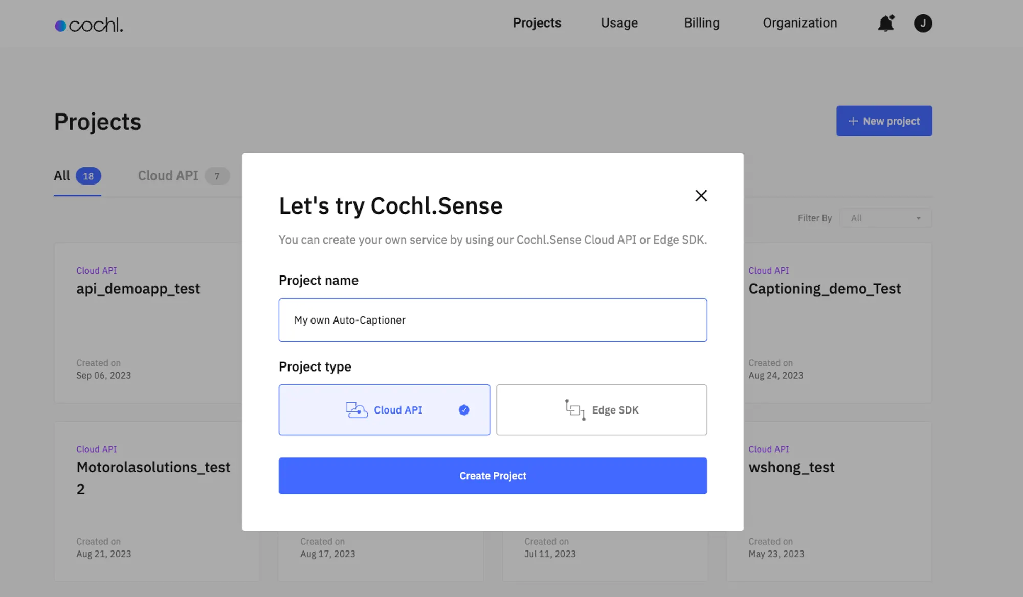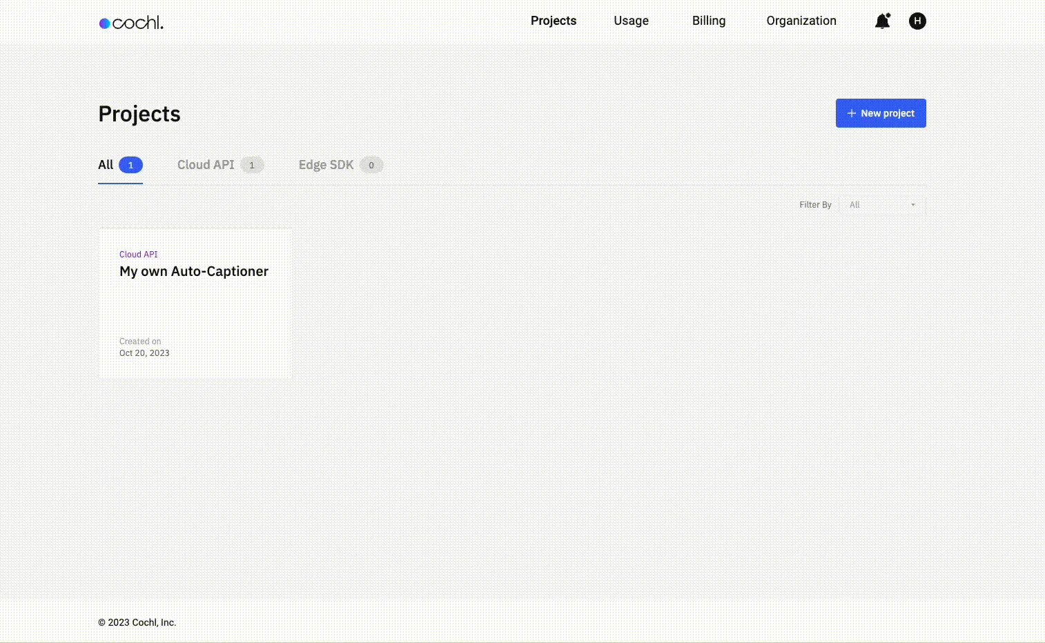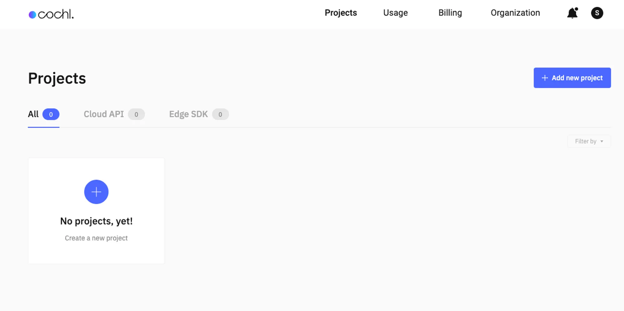3. [Add new project] 버튼을 눌러 Cloud API 프로젝트를 생성합니다. Dashboard에 나와 있는 Cloud API는 Cochl.Sense API와 동일한 개념입니다.