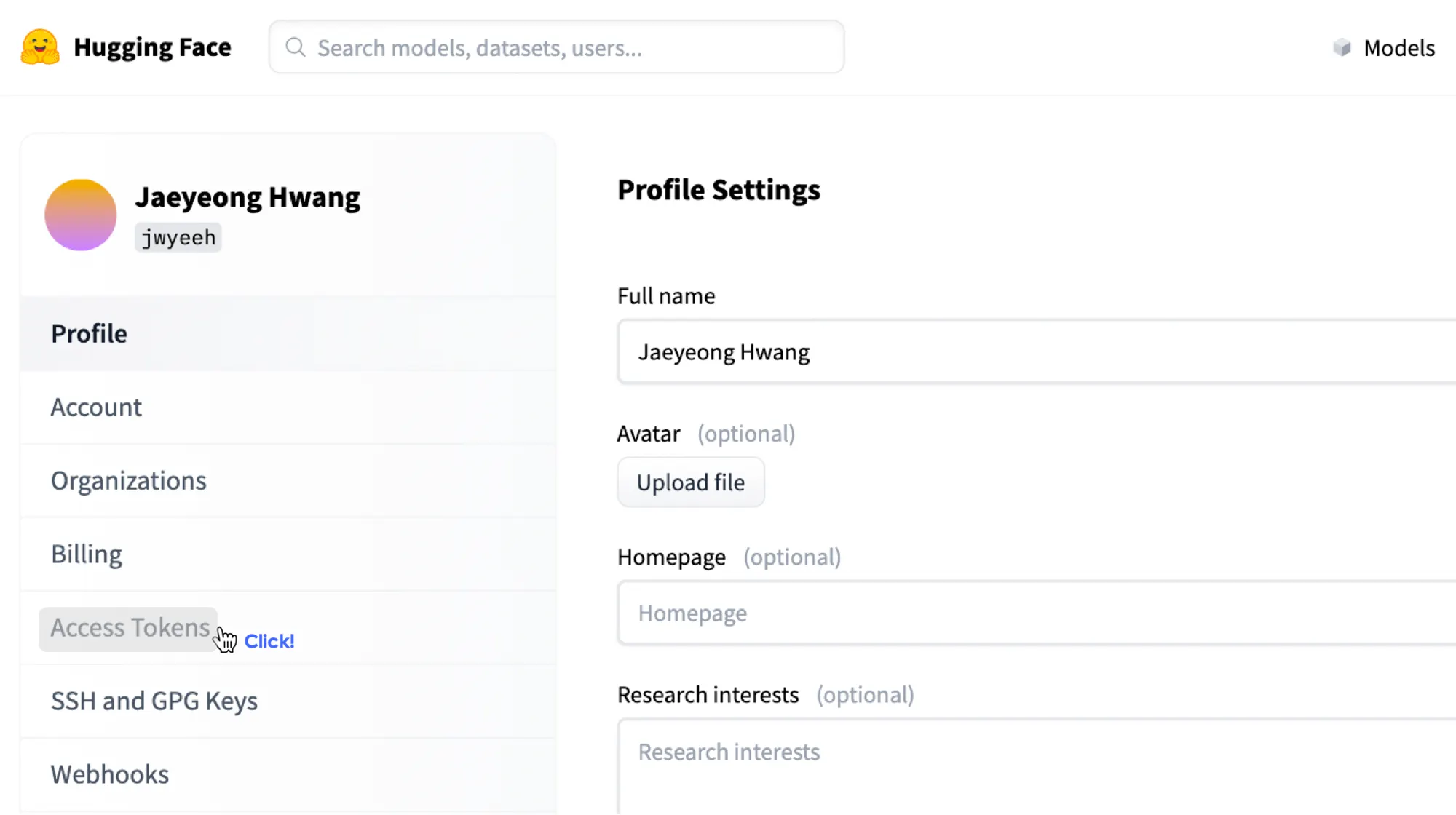 3. Settings에서 Access Tokens를 클릭합니다.