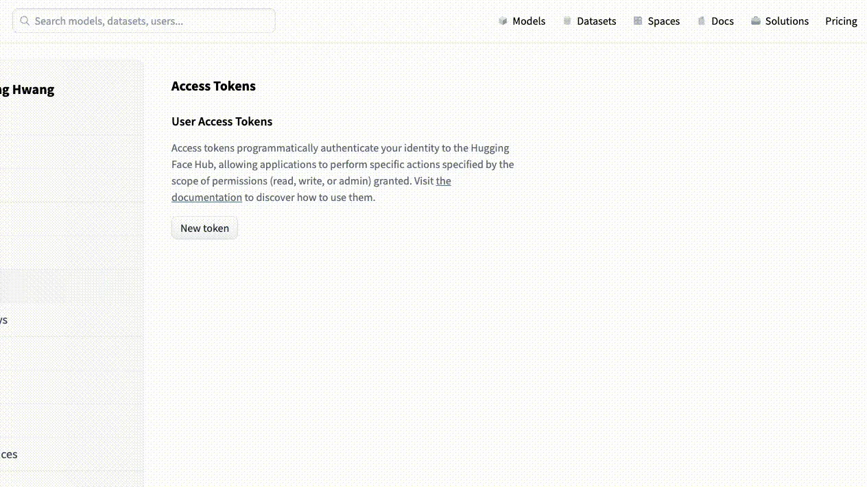 4. 해당 Access Token 배너에서 User Access Tokens를 생성 후 복사합니다. 해당 User Access Token은 추후 사용할 모델의 결과를 불러올 때 사용될 예정입니다.