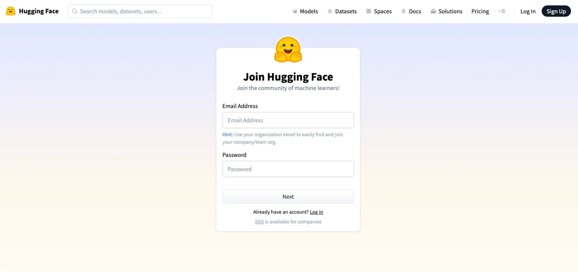 1. HuggingFace에서 모델 API를 사용하기 위해서는 HF Access Token을 발급받아야 합니다. 그러기 위해서는 HuggingFace 홈페이지로 이동 후 우측 상단의 Sign Up을 눌러 회원가입을 합니다.