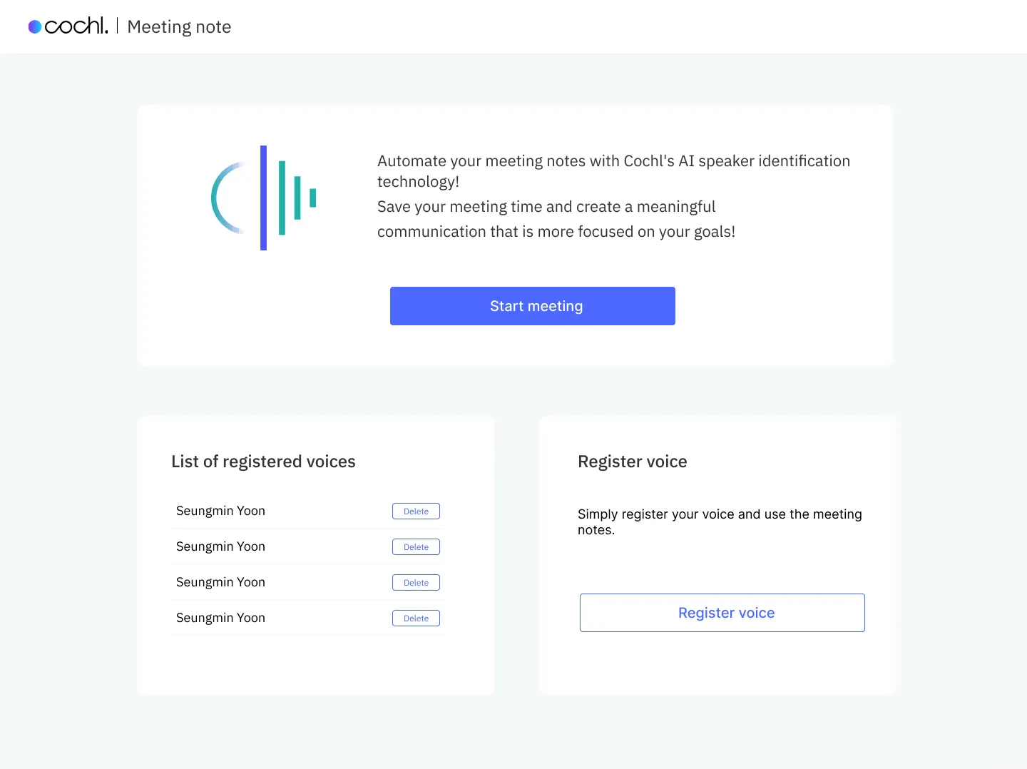 Meeting Note는 Cochl의 음성 인식 기술을 활용해 유용한 회의 시간을 만들어 주는 서비스로 사용자는 본인의 목소리를 주어진 정해진 문장을 읽는 방식으로 등록합니다. 그렇게 등록된 목소리를 바탕으로 ‘Start meeting’ 버튼을 눌러 미팅을 시작하게 되면, 각 화자가 말한 내용별로 회의록이 자동으로 생성됩니다.