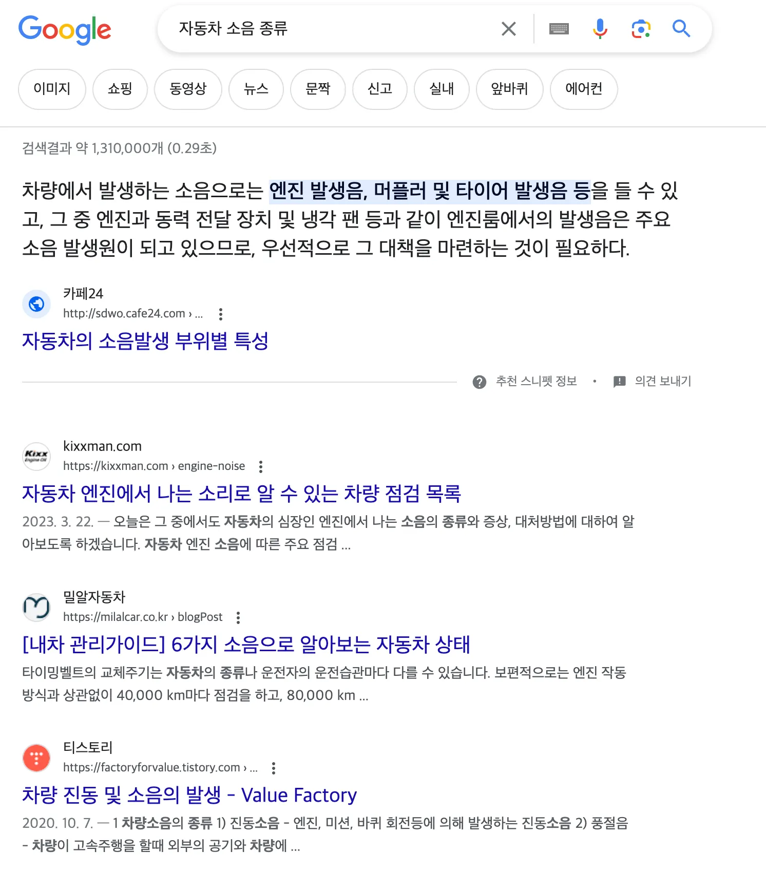 저의 경우에는 특별한 경우나 시기에만 사용하는 제습기였지만, 이런 소리가 내가 매일 사용하는 제품에서 난다면 어떨까요? 혹은 우리 삶에 조금 더 큰 영향을 미칠 수 있는 것들에서는요? 가령 ‘자동차 소리’ 라고 검색해보면 ‘빠직’, ‘쉬익', ‘끼긱', ‘딸깍’ 등 다양한 소리가 나는 것을 확인하실 수 있습니다. 차에서 소리가 나는 경우는 외부 발생과 내부 부품 결함 등으로 나눌 수 있는데, 탈 때마다 이유 모를 이상한 작은 소음이 괴롭힌다면 어떨까요? 만약 사고가 난다면 큰 피해를 유발할 가능성이 큰 자동차인데 이런 소음이 반복되면 불안하지 않을까요?