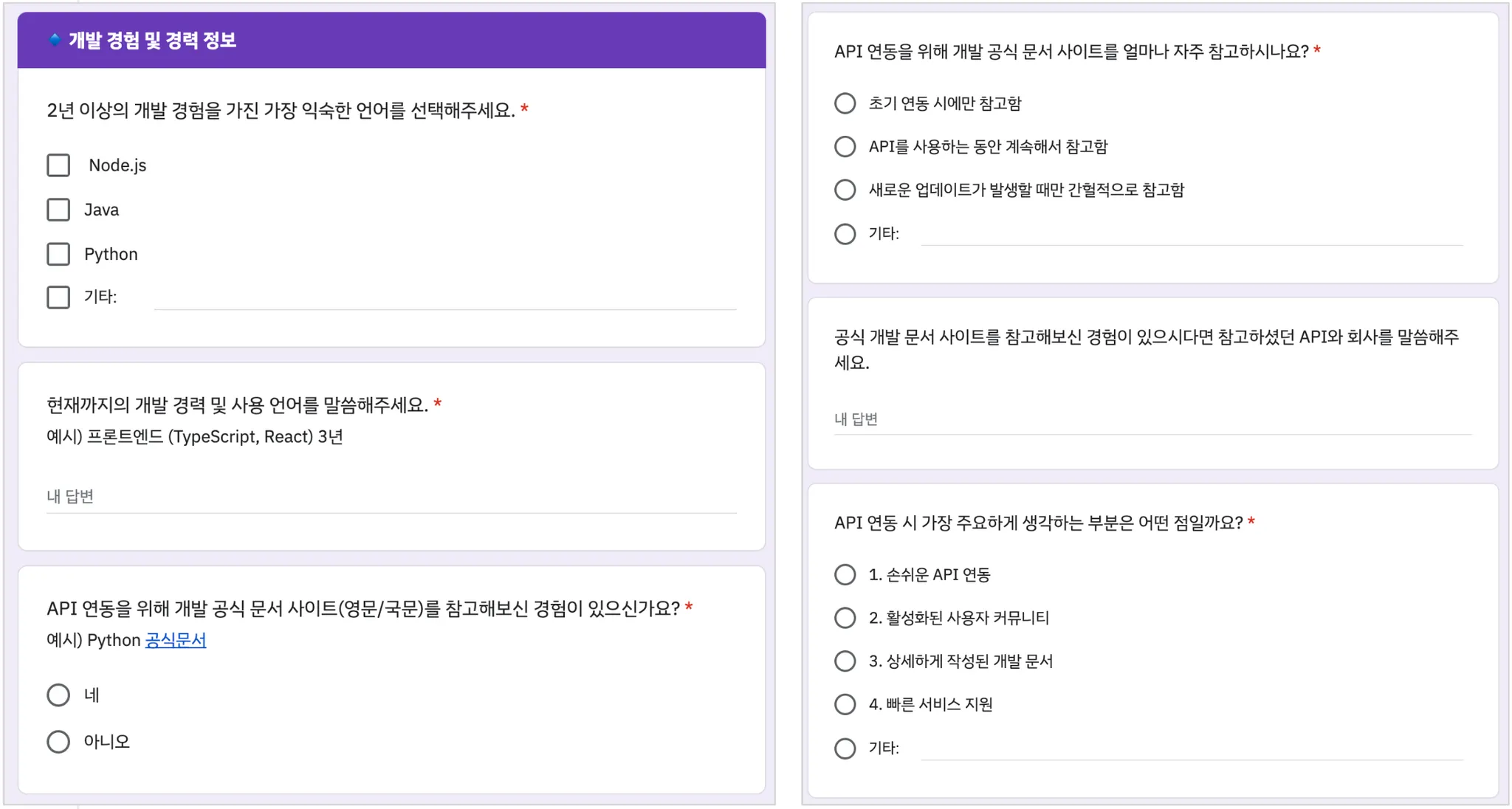 이번 사용성 테스트는 Cochl.Sense Cloud API의 사용성을 검증하는 데 목적을 두고 있기 때문에, 기존에 API를 연동해 본 경험이 중요했습니다. 경험의 유무와 더불어 API 연동 시 어떤 부분을 가장 중점적으로 고민하는지와 공식 사이트를 어느 정도의 빈도로 참고하는지에 대한 답변을 받아봤습니다.