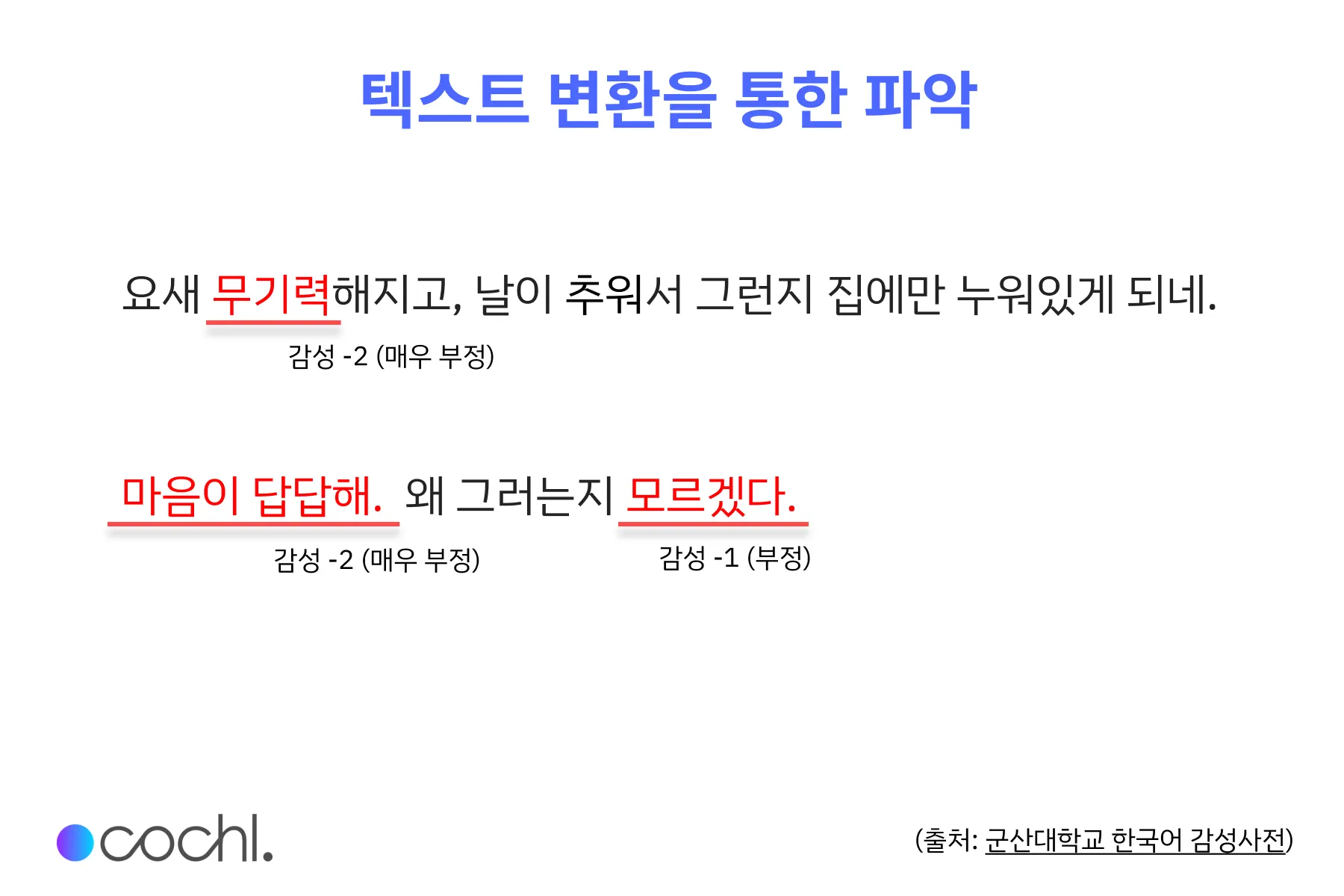 가령 부모님과 전화하는 상황에서 부모님께서 ‘요새 무기력해지고, 날이 추워서 그런지 집에만 누워있게 되네. 마음이 답답해. 왜 그러는지 모르겠다.’라고 말씀하신다면 발화된 문장을 텍스트로 변환한 다음, 미리 지정된 단어 데이터베이스 등을 활용하여 해당 문장에서 긍정어, 부정어, 중립어를 구분하고 수치화 합니다.