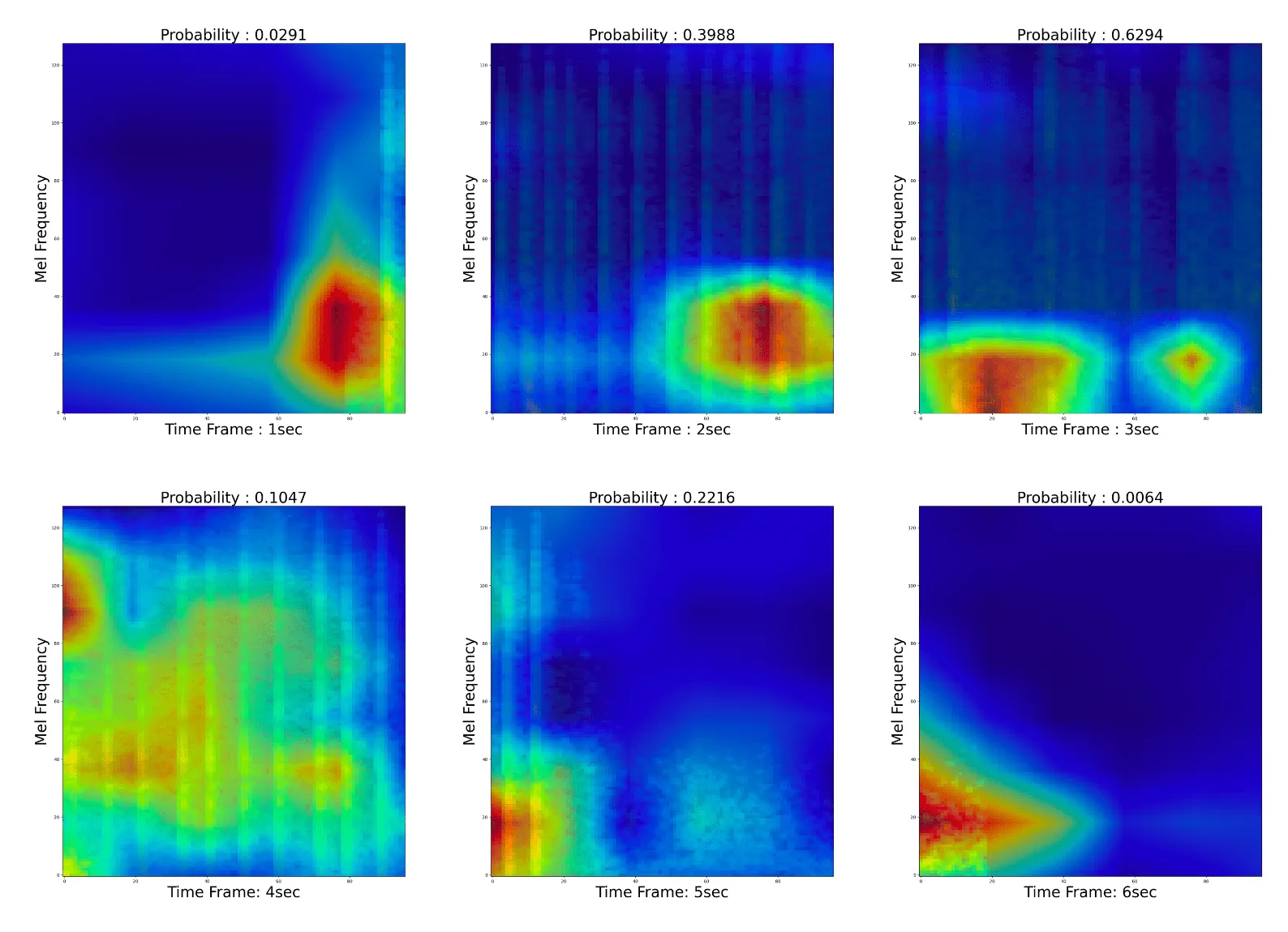 그리고 서브 프로젝트로는 인턴 때 진행했던 분석을 이어서 하고 있는데요, 저희 코클의 모델이 결괏값을 예측할 때 어떤 부분에 중점을 두고 예측을 진행하는지 분석하는 툴을 만들고 있거든요. 음원이 저희 모델을 통과할 때는 이미지 형태로 만들어진 뒤 결괏값이 도출됩니다. 모델을 통과할 때마다 처음엔 이미지 파일의 전체 부분을 분석하고 통과가 진행되면 특정 부분을 더 중점적으로 보게 됩니다. 가령 특정 주파수가 초록색으로 보이고, 나머지가 검은색이라면 처음에는 전체적인 그림을 보지만 모델을 통과하면 할수록 초록색 주파수 대역을 집중적으로 보게 되고, 대역이 어디에 존재하는지에 따라 분석 결괏값이 달라집니다.